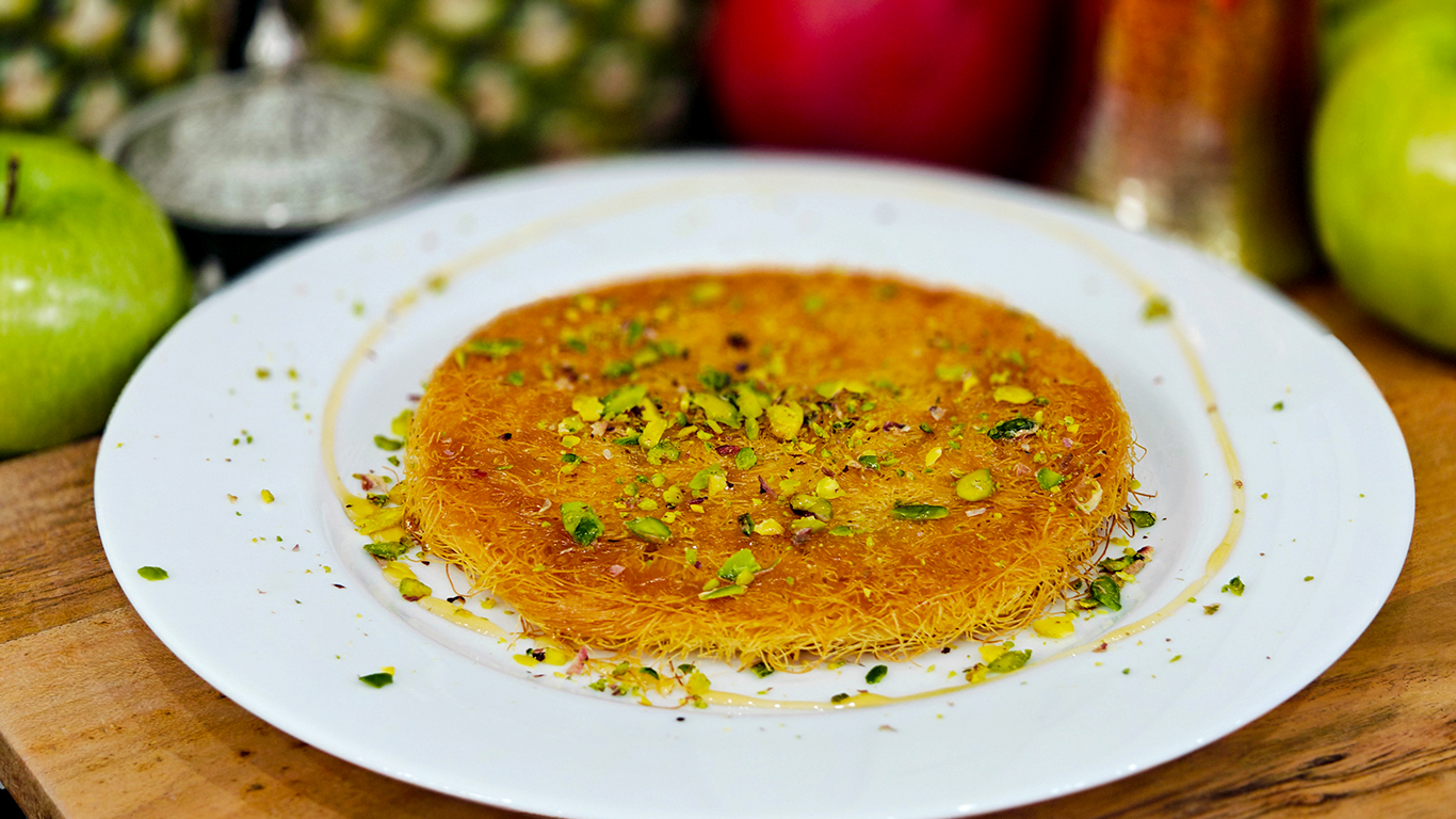 Authentic golden-crisp kanafeh pastry embracing a layer of perfectly melted cheese, generously soaked with fragrant honey syrup and adorned with vibrant crushed pistachios. This timeless Middle Eastern classic offers the perfect balance of crispy, cheesy, sweet, and nutty in every heavenly bite π§π―β¨.