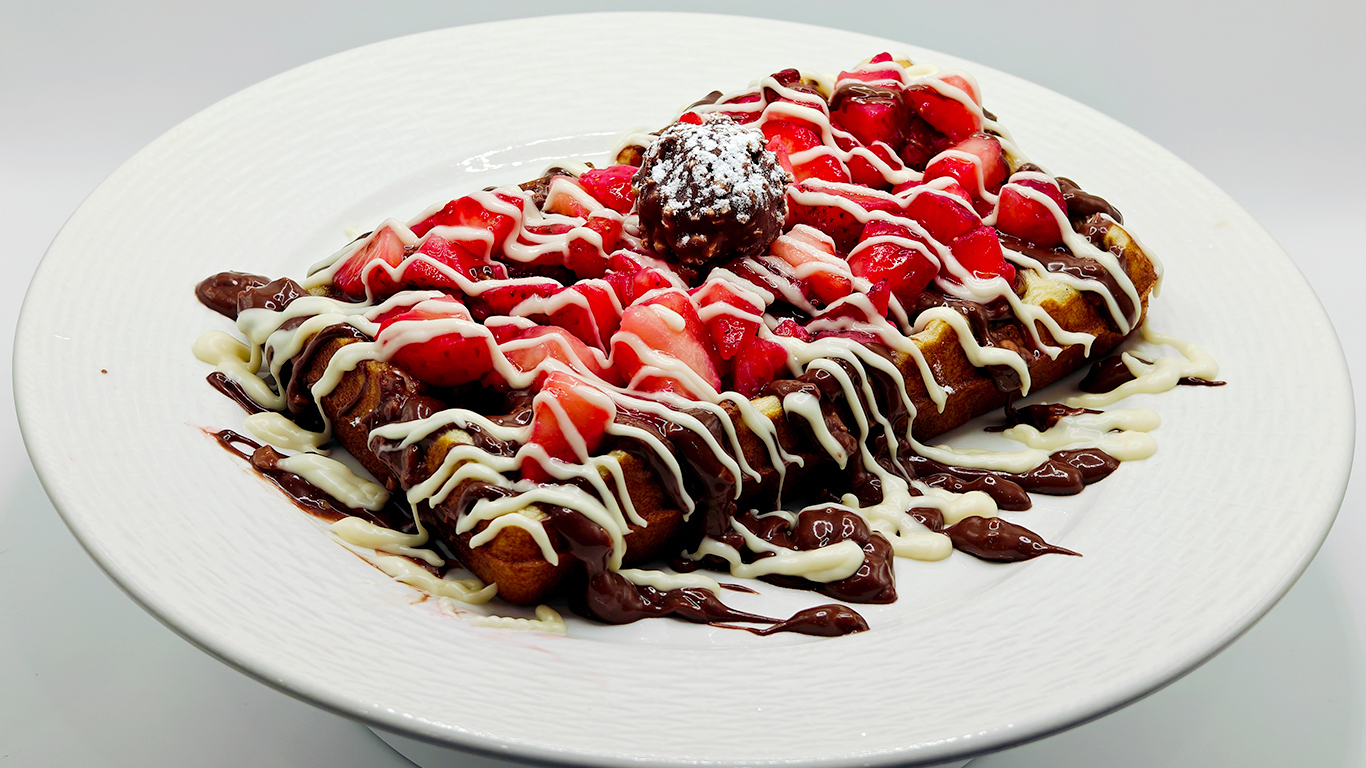Once perfectly cooked to crispy-on-the-outside, fluffy-on-the-inside perfection, the warm waffle becomes the sophisticated foundation for the iconic flavors of Ferrero Rocher. We generously drizzle our house-made Rocher creamβa silky, luxurious blend that captures the distinctive hazelnut-chocolate notes of the original confectionβacross the warm surface, where it melts slightly into the waffle's deep pockets, creating luscious pools of richness in every bite. Next comes a careful arrangement of Ferrero Rocher pieces, each containing that signature combination of smooth chocolate, crunchy wafer, and whole hazelnut center that has made this treat beloved worldwide. Fresh strawberry slices add a bright, juicy counterpoint that cuts through the richness while adding visual appeal. The interplay between the crispy waffle, rich hazelnut-chocolate elements, and fresh fruit creates a multi-dimensional dessert experience that's simultaneously sophisticated and indulgent. This European-inspired creation has quickly become a favorite among chocolate connoisseurs seeking a refined dessert experience. For the ultimate experience, enjoy with our signature hazelnut espresso to complement the nutty chocolate notes.