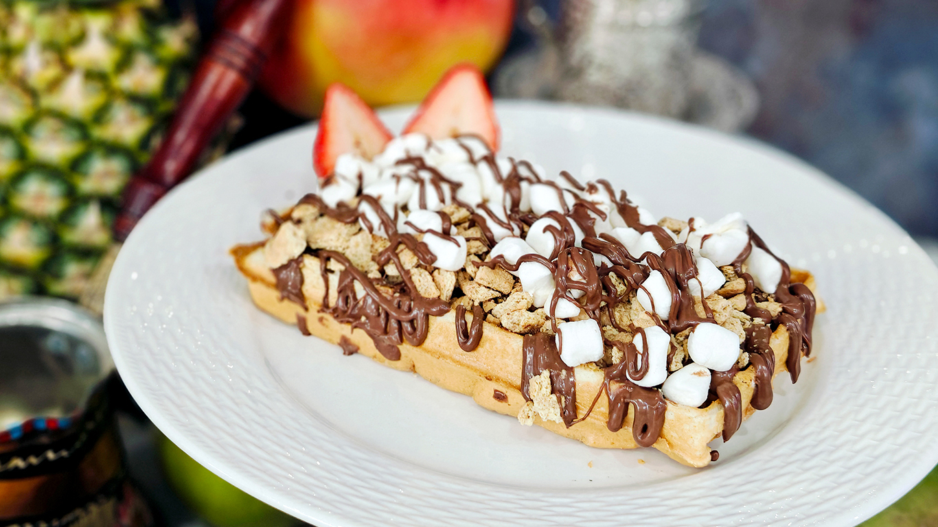 Once perfectly cooked to crispy-on-the-outside, fluffy-on-the-inside perfection, the warm waffle becomes the sophisticated foundation for the quintessential flavors of a classic American s'more. We layer premium crushed graham crackers for that distinctive honey-sweet crunch, followed by a generous portion of marshmallows that are carefully melted to achieve that perfect gooey consistency without becoming overly liquid. Rich chocolate sauce is then drizzled throughout, seeping into the waffle's deep pockets and creating intense bursts of chocolate flavor that mimic the melted chocolate bar of a traditional s'more. The interplay between the crispy waffle, crunchy graham crackers, gooey marshmallows, and rich chocolate creates a multi-dimensional dessert experience that's simultaneously sophisticated and playfully nostalgic. This creative interpretation has become a favorite among those seeking a refined version of this campfire classic, perfect for enjoying the familiar flavors without the need for a bonfire. For the ultimate experience, enjoy with our signature hot chocolate to amplify the cozy, comforting flavors.